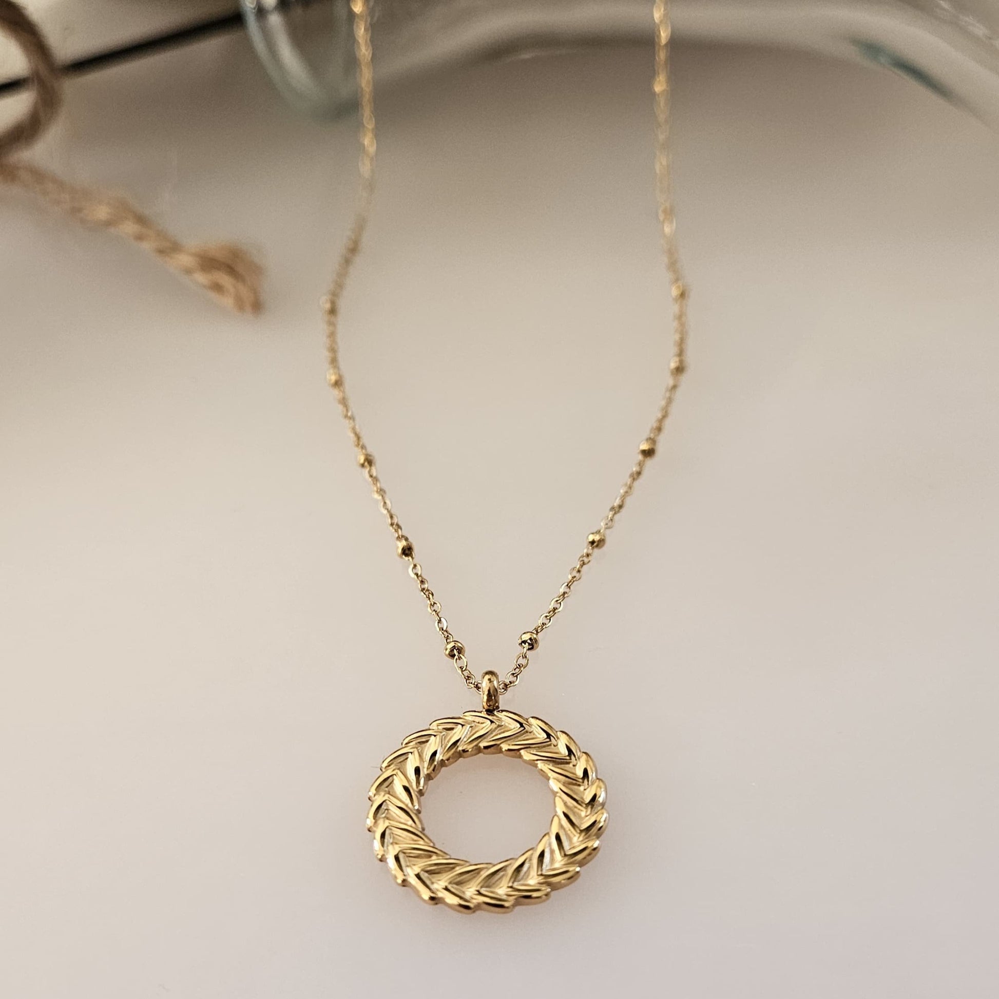 Le Collier Heiana offre un design minimaliste avec une touche artistique. Son pendentif circulaire est finement travaillé avec un motif tressé, offrant une texture intrigante et une finition dorée éclatante, suspendu à une chaîne assortie.